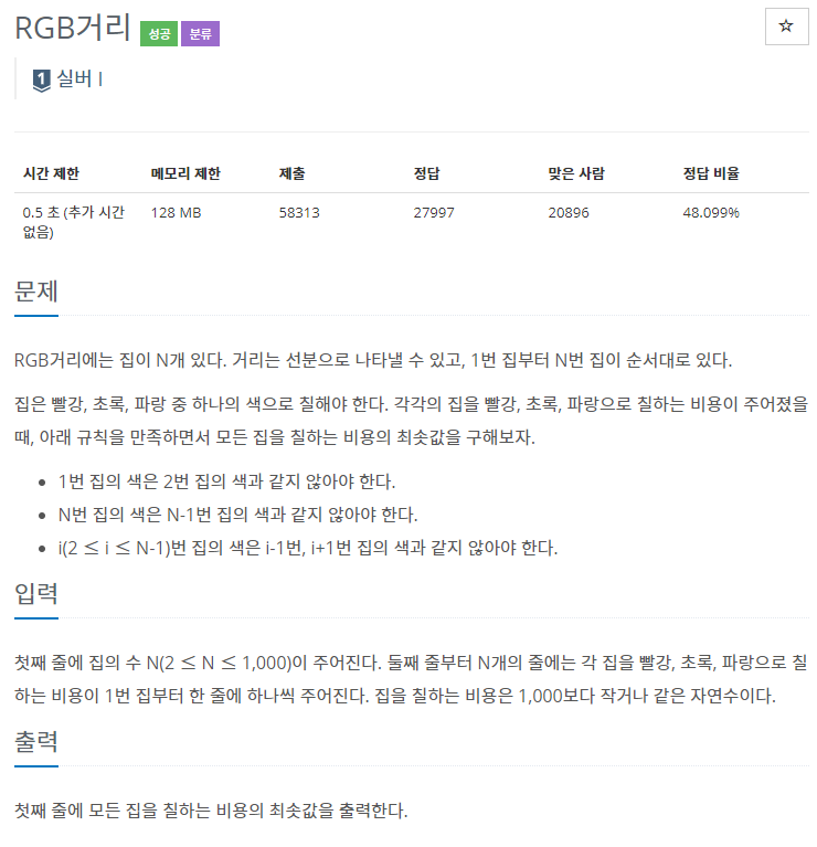 위 문제는 n번째 집에 색칠할때 드는 최소비용이 n-1번째의 집에 색칠할때 드는 최소비용과 연관이 있는 최적 부분 구조가 있어 다이나믹 프로그래밍을 통해 문제를 해결할 수 있었다.