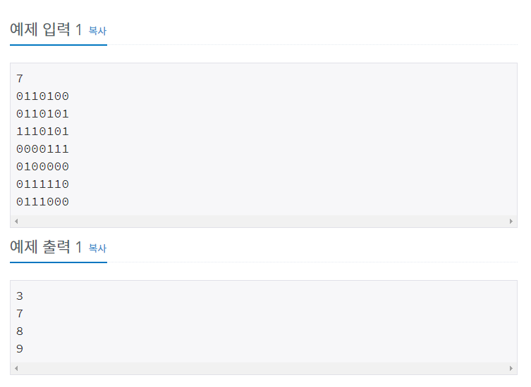<그림 1>과 같이 정사각형 모양의 지도가 있다. 1은 집이 있는 곳을, 0은 집이 없는 곳을 나타낸다. 철수는 이 지도를 가지고 연결된 집의 모임인 단지를 정의하고, 단지에 번호를 붙이려 한다. 여