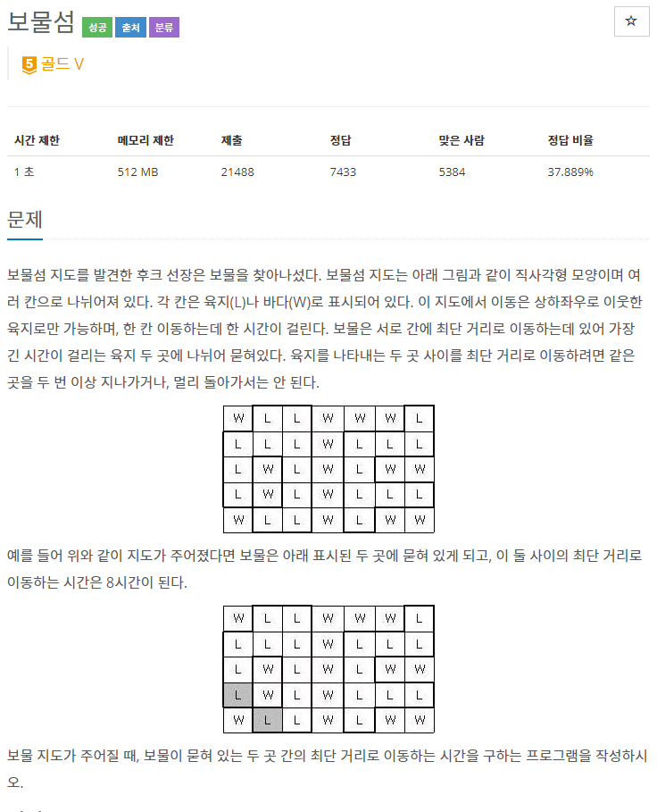 육지 위 기준 거리가 가장 긴 곳에 보물이 묻혀있다. 최단경로 문제이니 너비우선탐색을 통해 문제를 구상했고,