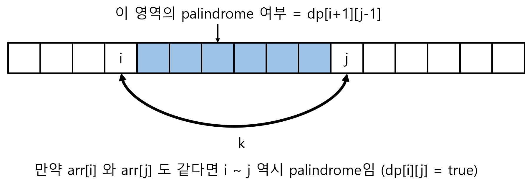 - dp[i][j] 가 1이라는 것은 i 번 인덱스부터 j번 인덱스까지의 문자열이 회문이라는 것을 의미한다.