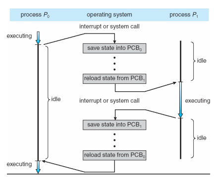 여러 이유를 통해 P0이 전환되어야 하는 상황에서, 운영체제는 CPU의 제어를 뺏어온 뒤interrupt or system call, Context Switch를 수행합니다. Context Switch를 성공적으로 하기 위해서는 먼저 수행중이던 P0의 현재 상황을 P0의 PCB에 저장해야 합니다save state into PCB0. 어떤 명령어를 수행하다가 멈췄는지, 현재 어떤 함수를 수행하다가 멈췄는지에 대한 정보가 저장되어있어야 이후 다시 context switch를 통해 P0의 차례가 됐을 때 프로그램이 마저 동작할 수 있기 때문입니다. P0의 정보를 저장한 다음, CPU의 레지스터에는 PCB1 의 context 정보를 불러옵니다reload state from PCB1. 이를 통하여 CPU는 자연스럽게 P1을 수행할 수 있습니다.