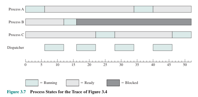 Ready 상태의 프로세스들은 CPU를 획득하기 위해 기다리고 있는 프로세스 상태를 의미합니다. 레디 상태에 있는 프로세스들의 PCB는 큐로 관리되어, context switch에 의해서 프로세스를 점유하게 될 시점을 기다립니다. 이후 context switch에 의하여 프로세스를 점유하게 되면, 프로세스는 Running 상태가 됩니다. 이때 context switch를 하는 과정을 dispatch라고 부르기도 합니다.