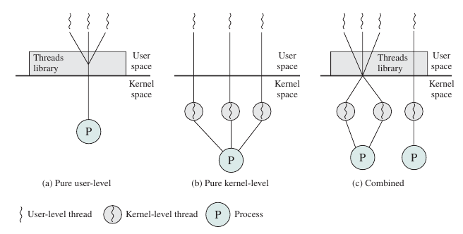 현대의 시스템들은 ULT 와 KLT의 특성을 모두 활용하는 혼합된 방식을 채택하기도 합니다. 위 그림의 (c)가 그 예시입니다. 이러한 방법을 통해 각기 다른 쓰레드 모델의 장점을 극대화 할 수 있습니다.