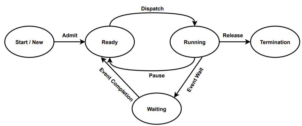 Start 혹은 New 상태는 프로세스의 생성을 요청받아 필요한 초기화를 하는 상태를 의미합니다. 이후 수행되기 위한 모든 준비가 완료되면 프로세스는 Ready 상태로 바뀝니다.