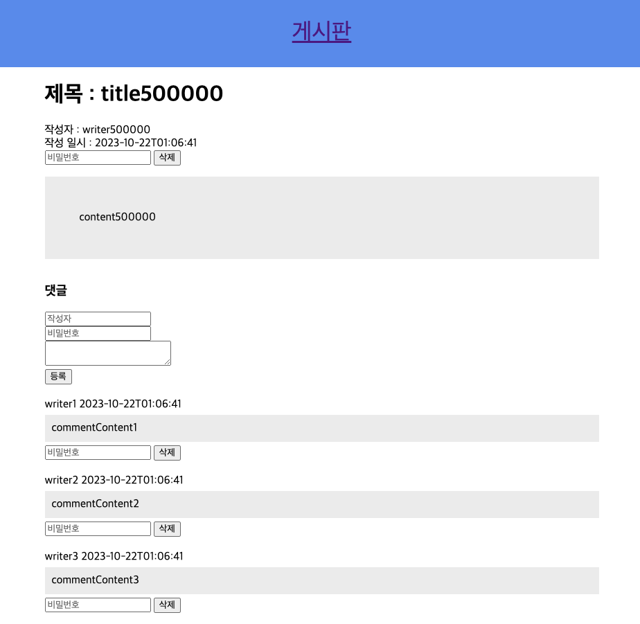 댓글 게시판은 마치 글 게시판 처럼 댓글의 목록을 페이지네이션으로 볼 수 있는 기능입니다. 이는 일반적인 서비스에서는 제공되지 않지만, 이번 토이프로젝트에서는 성능 개선의 효과를 크게 느낄 수 있을 것 같아 만들어 보았습니다.